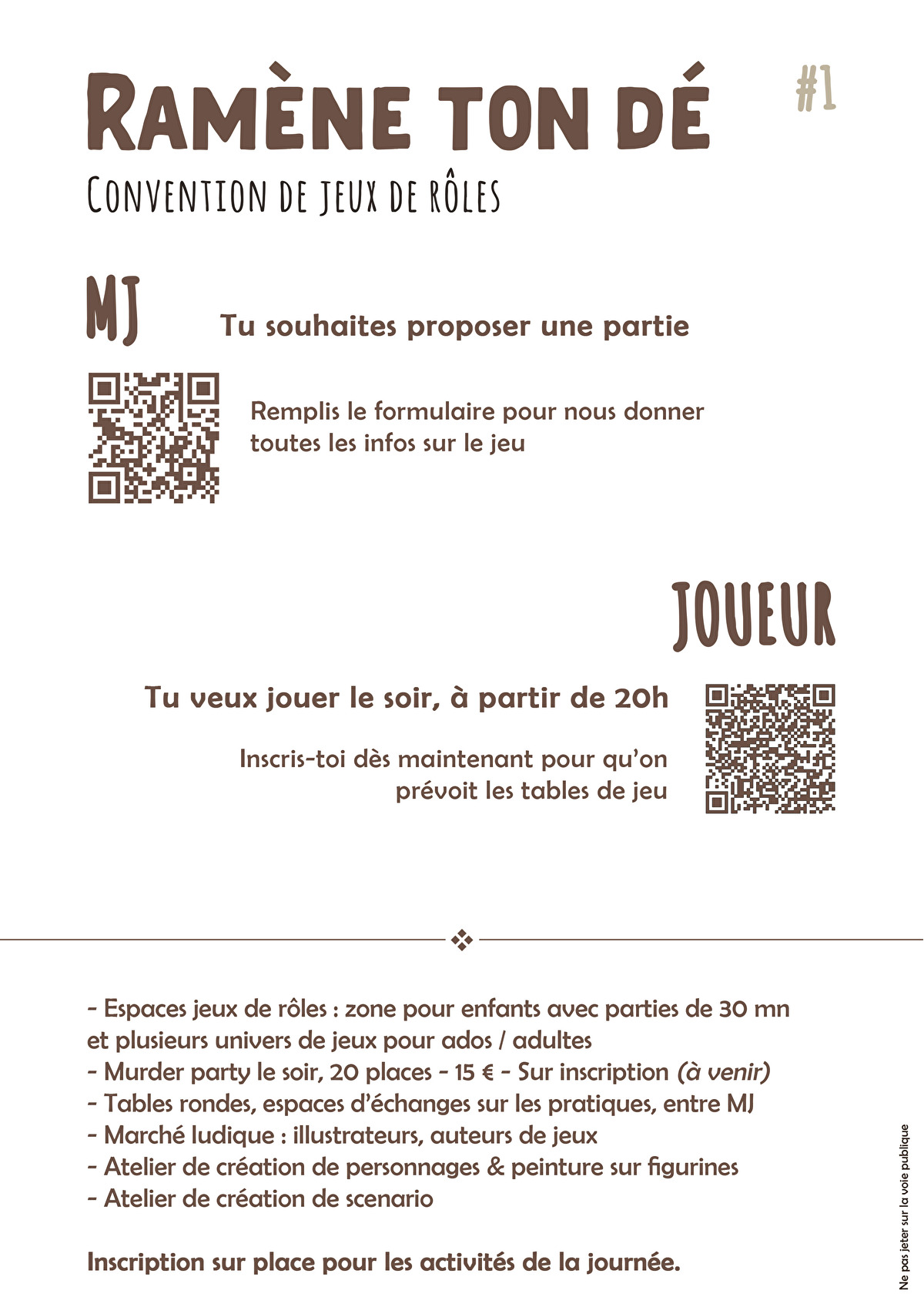 La 1ère édition de cette rencontre dédiée aux jeux de rôles, destinée à rassembler les joueurs de tous les âges et de tous les univers, et les acteurs du jeu sur le territoire : assos, auteurs, éditeurs, MJ, créatifs et artisans. Une journée pour jouer, s’amuser, découvrir, faire des rencontres.