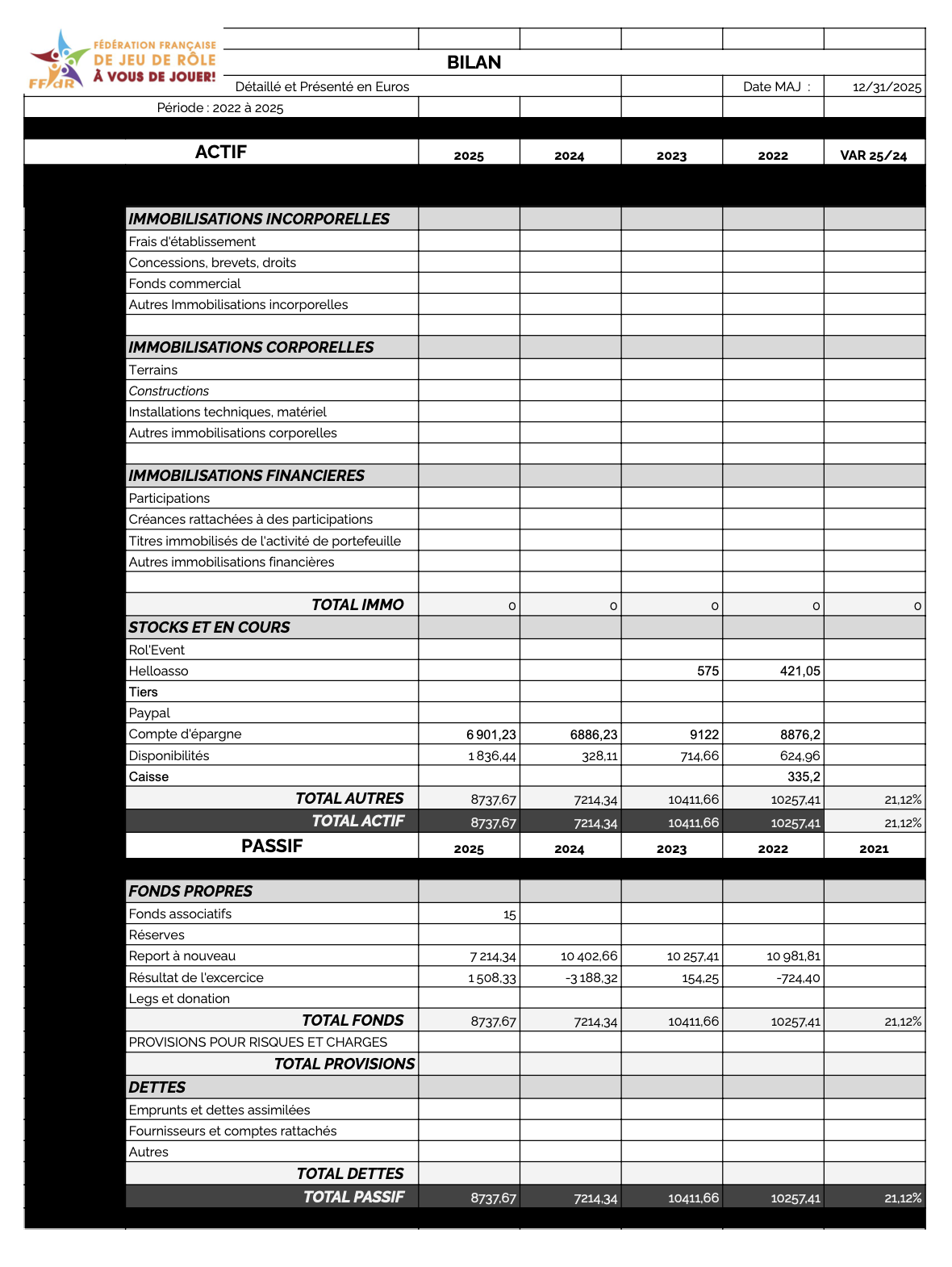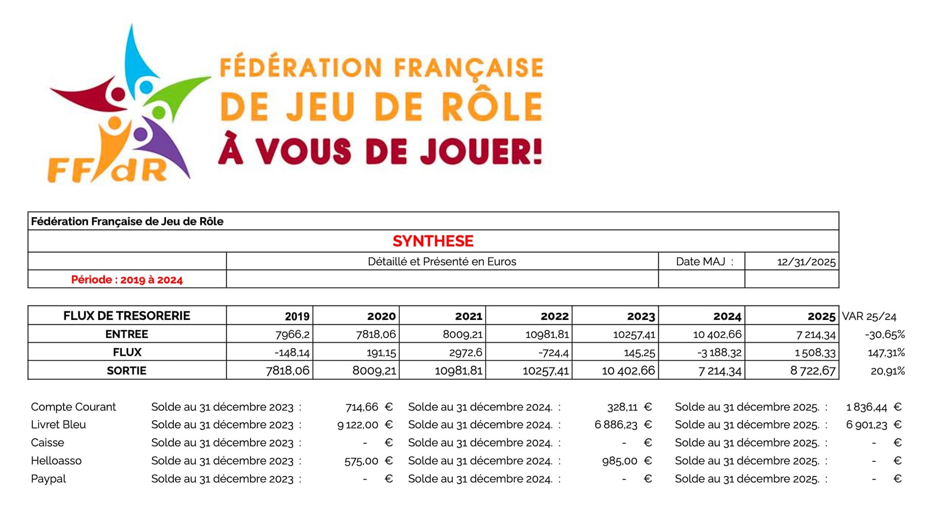 L’association fonctionne correctement avec un budget maitrisé. Toutefois on remarque une perte importante en 2024. Cela s’explique par la participation de la FFJDR lors de l’événement Japan Expo 2024. En effet sur cet événement la FFJDr a pris en charge pas mal de choses en ce qui concerne l’animation. Cela a occasionné des frais plus importants que prévus. L’objectif lors de cet événement était de faire en sorte que la FFJDR puisse avoir le plus grand rayonnement possible.Pour celles et ceux qui auraient pu y aller il y avait un plateau télé qui avait été proposé. Cela a aussi été l’occasion de pouvoir produire 3 vidéos de promotion de la ffjdr :