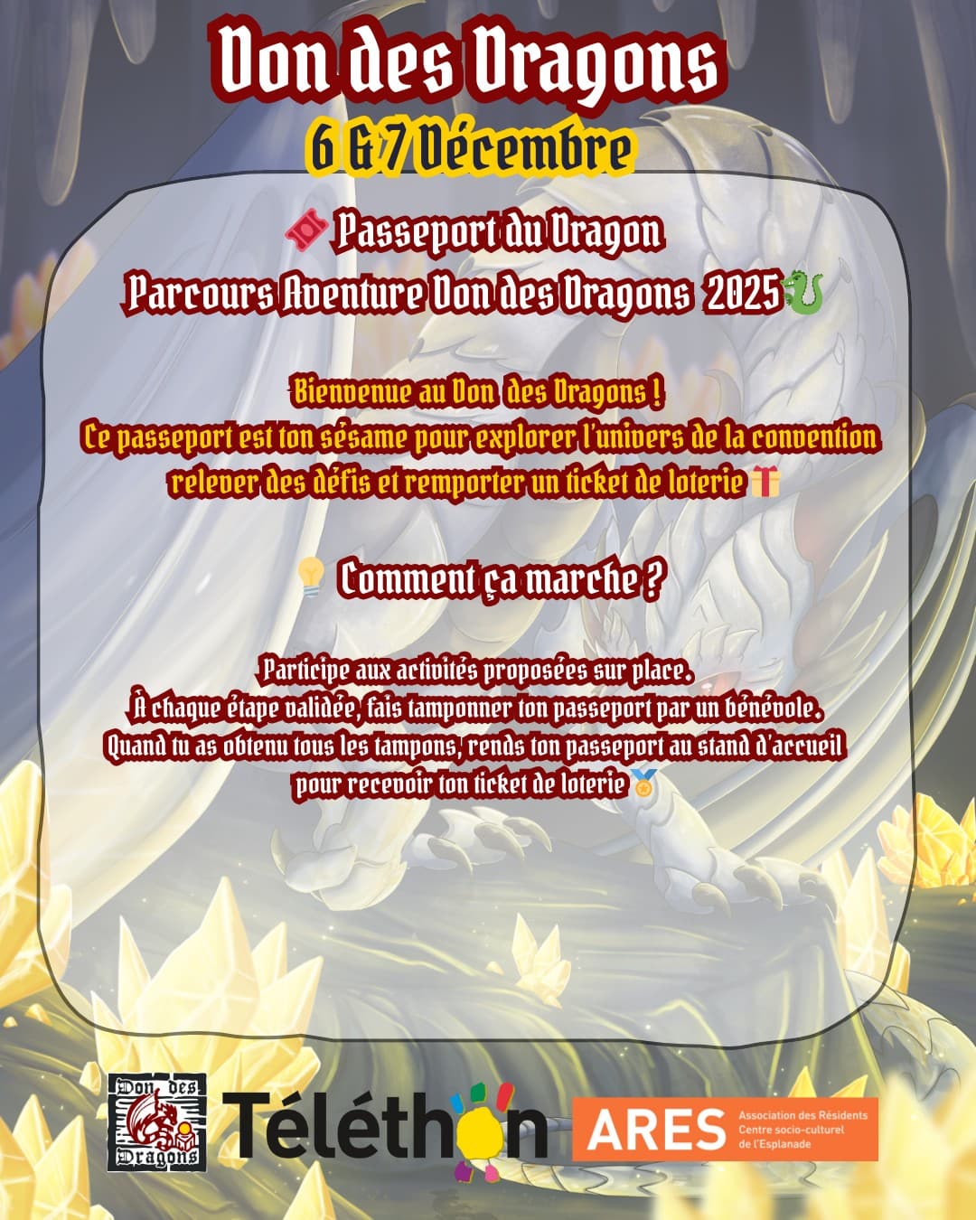 Pour rappel : le Don des Dragons est une convention de jeux dont l’intégralité des bénéfices sont reversés au Téléthon.