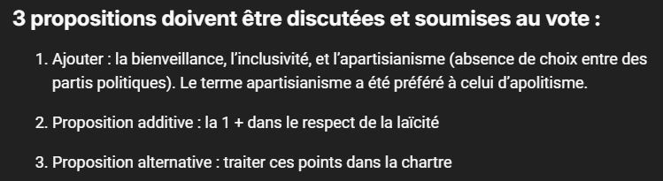 Ajouter : la bienveillance, l’inclusivité, et l’apartisianisme (absence de choix entre des partis politiques). Le terme apartisianisme a été préféré à celui d’apolitisme.