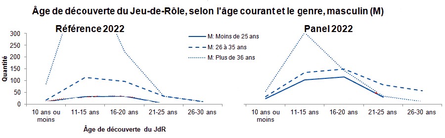 Grosso modo, environ un quart de la population de référence du Thiase a répondu à la prise de contact direct par mailing du Thiase. Donc il est réciproquement raisonnable d’évaluer que le panel interrogé par le Thiase en 2022 représente moins d’un quart des nouvelles personnes qui s’impliquent dans la pratique rôliste. Précisément parce que le panel 2022 n’a pas été contacté directement, ce qui rend ce panel davantage dépendant du taux de couverture qui réunit les médias spécialisés, les réseaux sociaux et la propagation directe entre pratiquants et pratiquantes.